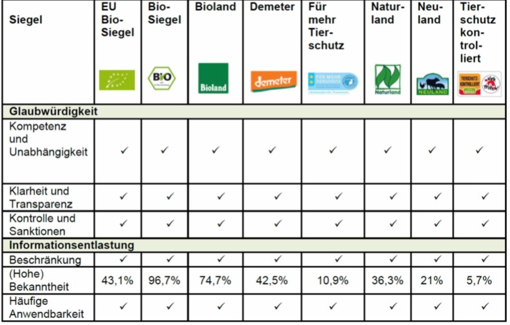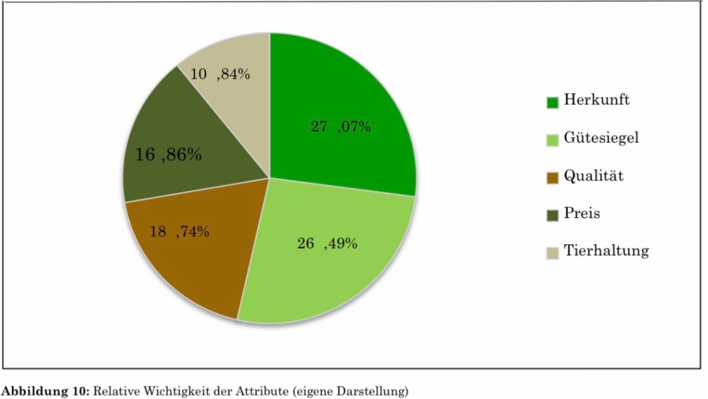 An dieser lässt sich ablesen, welche Aspekte beim Einkauf von Lebensmittel für den Kunden von Relevanz sind. Es lässt sich klar ablesen, welche Relevanz das Gütesiegel für den Kunden hat. Dass das Produkt über ein Gütesiegel verfügt hat so mehr Relevanz und Gewichtung als Tierhaltung, Qualität und Preis. Es sollten nun bei jedem Endverbraucher die Alarmglocken angehen, wie sehr man sich von diesen Gütesiegeln beeinflussen, vielmehr manipulieren, lässt.