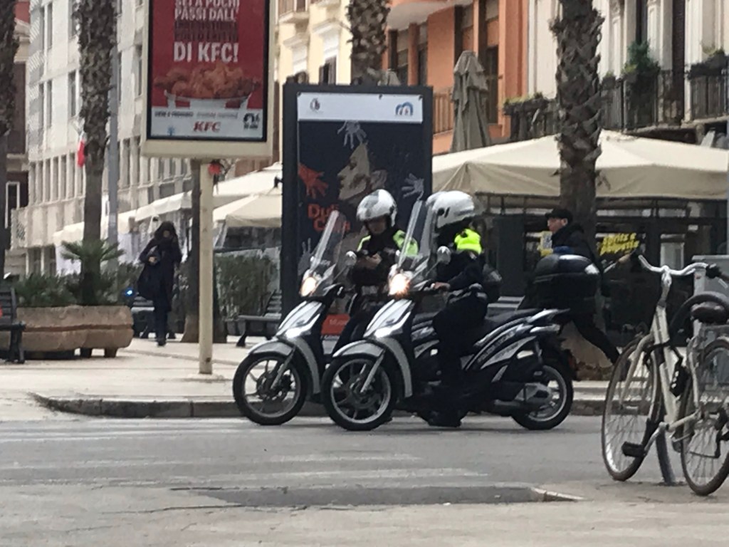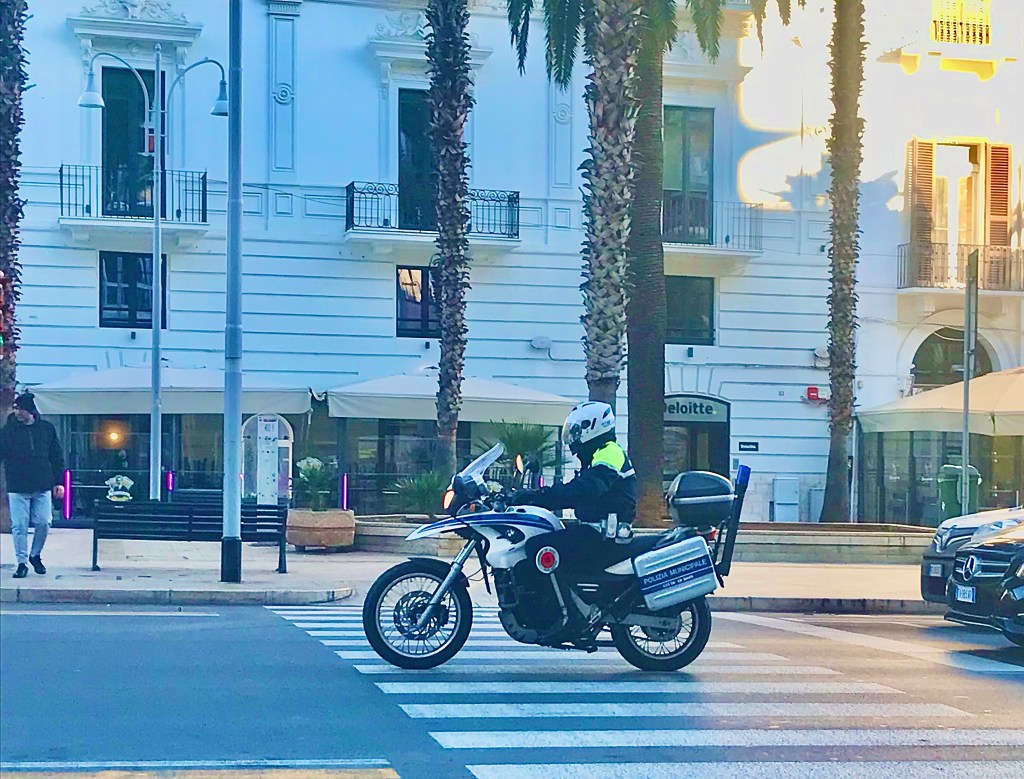 In Deutschland eigentlich unvorstellbar, hier in Italien wie bereits erwähnt der tägliche Wahnsinn. Polizia Locale fährt ohne Helm mit hochmotorisierten Motorrädern und nicht gerade langsam durch die Straßen.
