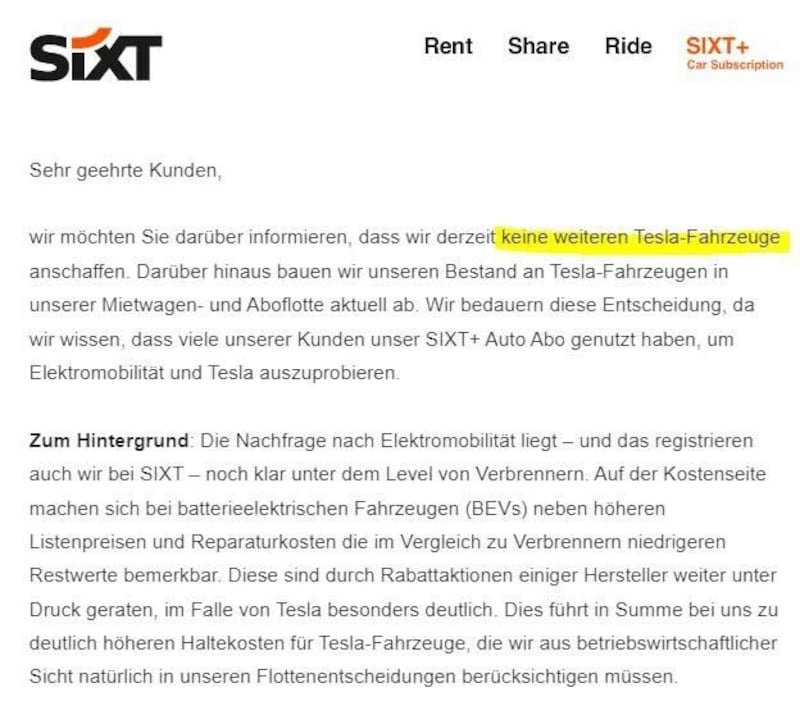 » … Wir möchten Sie darüber informieren, dass wir derzeit keine weiteren Tesla-Fahrzeuge anschaffen. Darüber hinaus bauen wir unseren Bestand an Tesla-Fahrzeugen in unserer Mietwagen-Aboflotte aktuell ab. … «