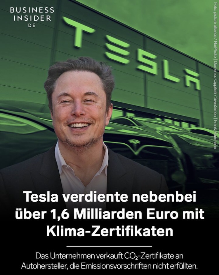 »Tesla hat im vergangenen Jahr 1,79 Milliarden US-Dollar (etwa 1,66 Milliarden Euro) mit dem Verkauf von sogenannten „Regulatory Credits“ (CO₂-Zertifikate) eingenommen. Das geht aus einem Dokument der US-Börsenaufsichtsbehörde Securities and Exchange Commission hervor. Das Unternehmen erwirbt die CO₂-Zertifikate durch die Herstellung und den Verkauf von Elektrofahrzeugen. Diese kann es dann an andere Autohersteller verkaufen, die nicht genügend Elektrofahrzeuge hergestellt haben, um die von den Regulierungsbehörden in den USA, Europa und China auferlegten Emissionsvorschriften zu erfüllen. […] «