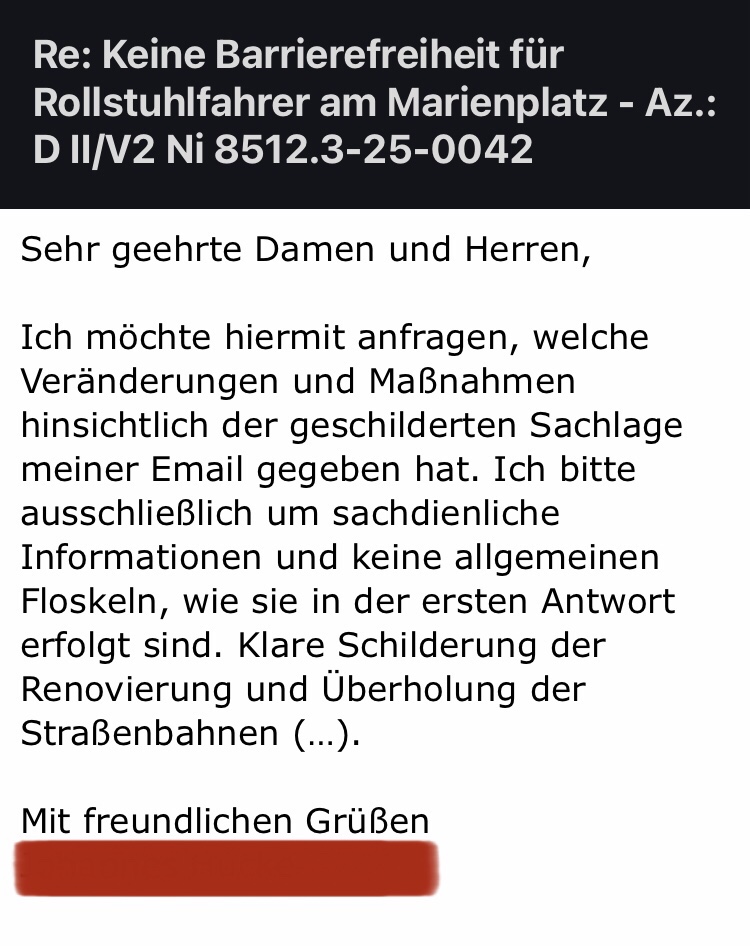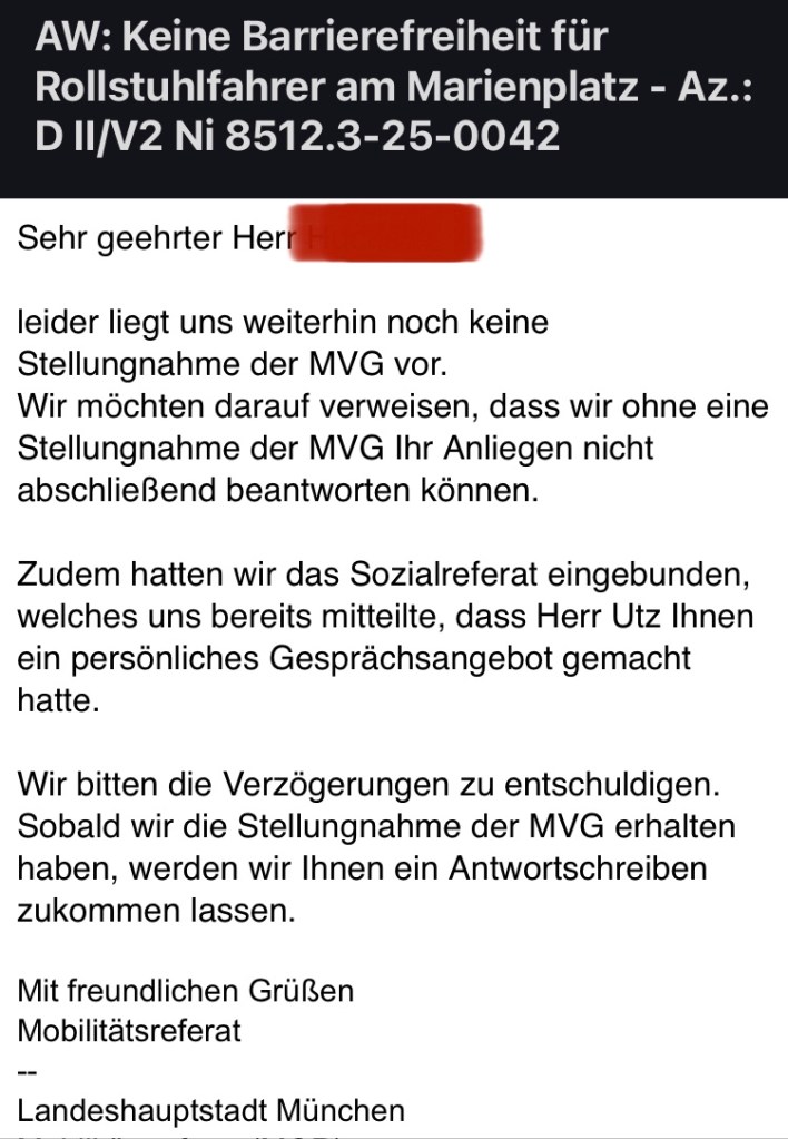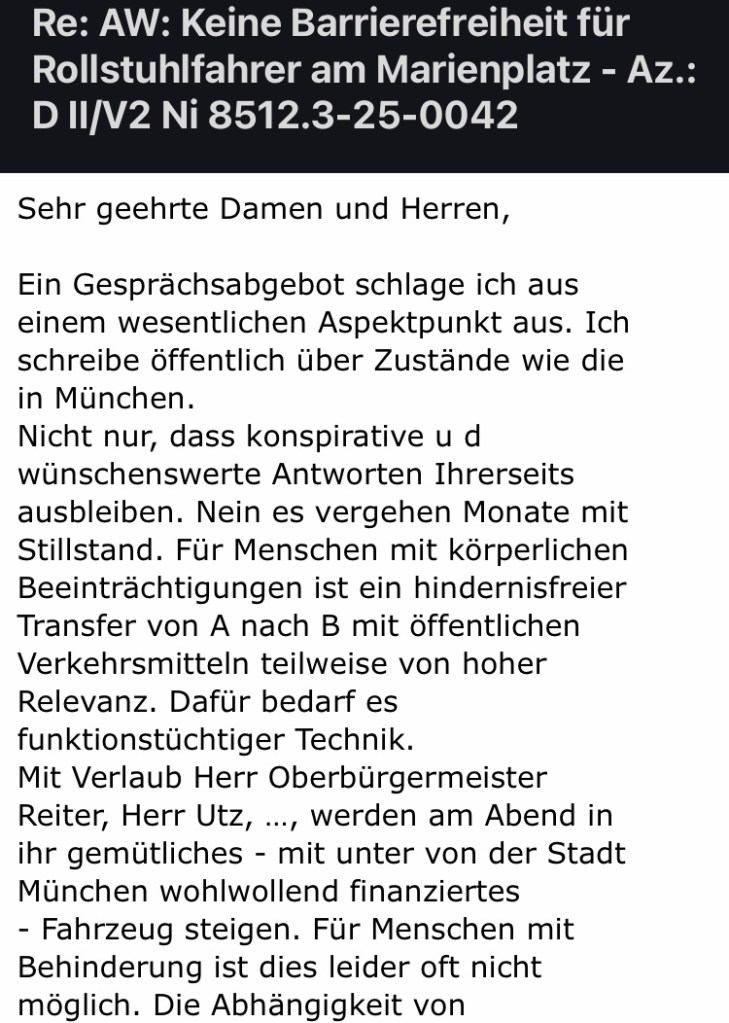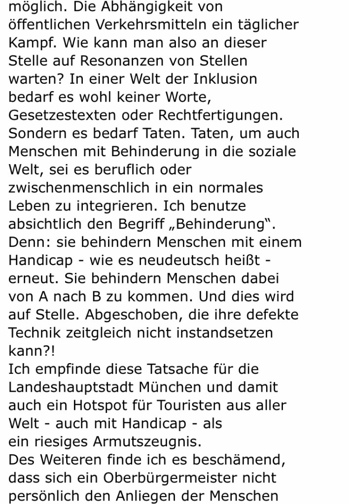Nach meiner Mail und Beschwerde an die Stadt München mit Hinblick auf technische Probleme bei Einrichtungen für Gehbehinderte / Rollstuhlfahrer in München erholt ich nach der ersten Antwort keine weiteren Informationen.