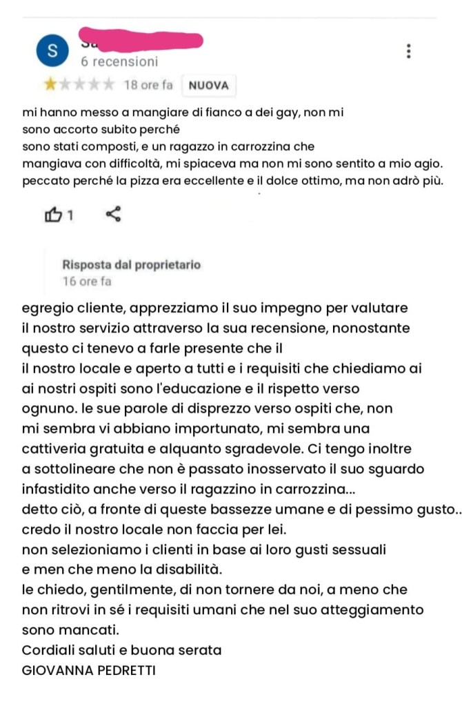 Im Originaltext (übersetzt) antwortete Giovanna Pedretti auf die Bewertung wie folgt:
