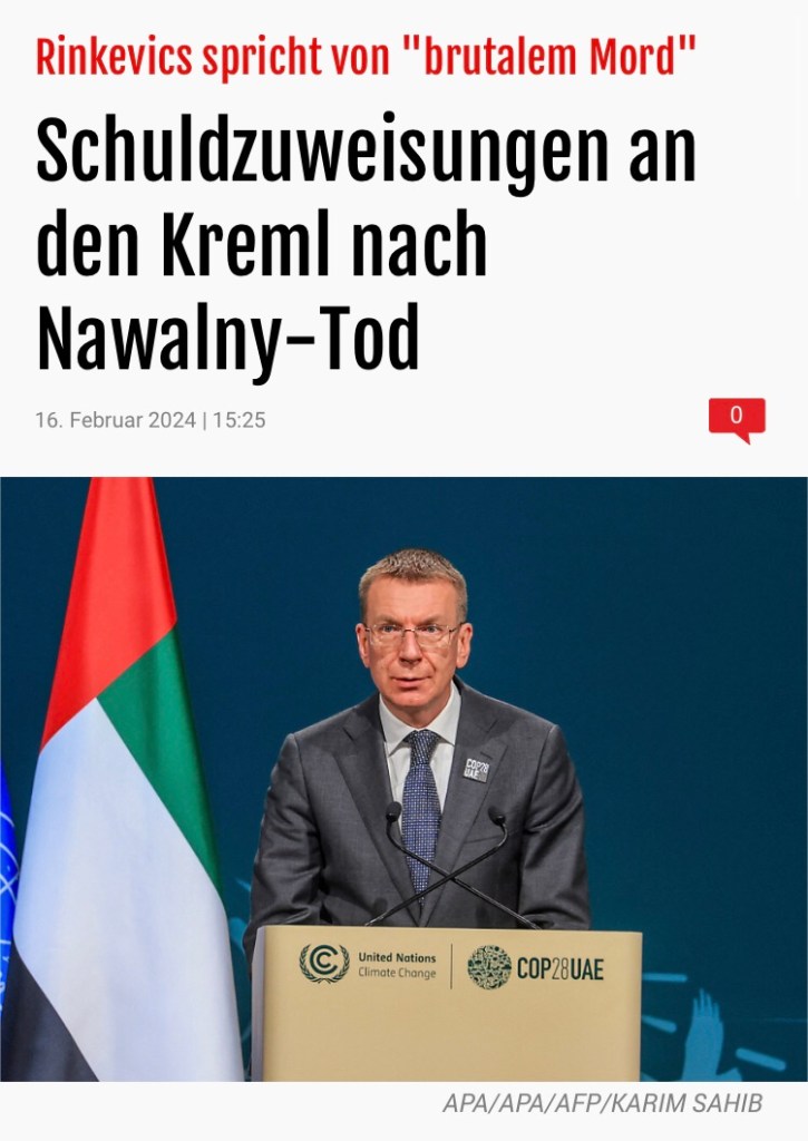 » […] Nach dem Tod von Oppositionsführer Alexej Nawalny gibt es international scharfe Kritik am russischen Regime. Der Kreml habe Nawalny “brutal ermordet”, schrieb der lettische Präsident Edgars Rinkevics am Freitag auf Twitter. EU-Ratspräsident Charles Michel und US-Außenminister Antony Blinken machten Russland für den Tod verantwortlich. […] «