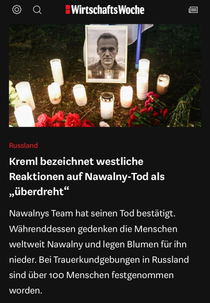 » […]Der Tod von Kremlgegner Alexej Nawalny in einem russischen Straflager hat weltweit Entsetzen ausgelöst. Viele Beobachter machten Präsident Wladimir Putin direkt für den Tod seines 47 Jahre alten Kritikers verantwortlich, über den am Freitag zuerst russische Staatsmedien unter Berufung auf den Strafvollzug berichtet hatten. Auch US-Staatschef Joe Biden wählte scharfe Worte in Richtung Putin. […]«