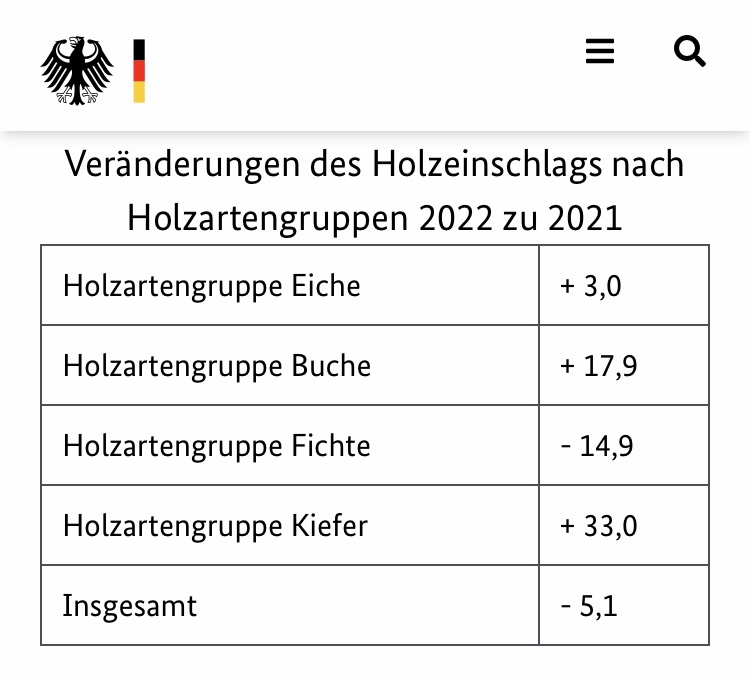 » […] Im Wirtschaftsjahr 2021 lag der Holzeinschlag in Deutschland bei 82,9 Mio. m³und damit 3,2 % über dem Vorjahreswert. Die Folgen des Klimawandels haben auch im Jahr 2021 trotz regional niedrigeren Jahresdurchschnittstemperaturen und höheren Niederschlägen bei der Holzernte in Deutschlands Wäldern nachgewirkt. […] «