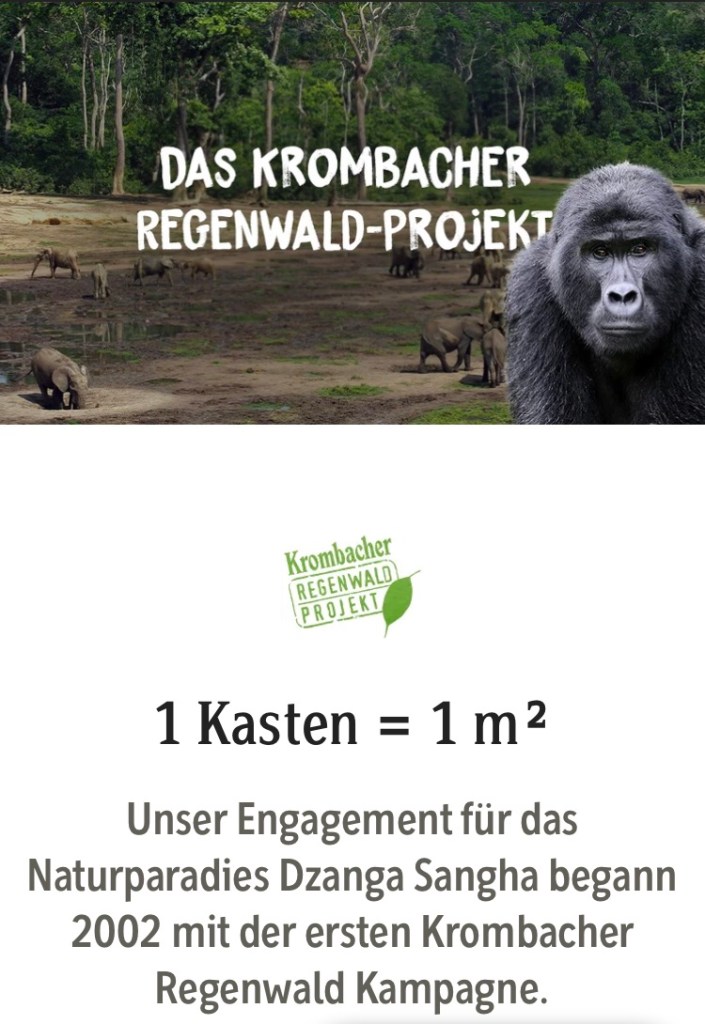 Zur Information: Das Dzanga-Sangha-Schutzgebiet liegt im Süden der Zentralafrikanischen Republik in der Nähe des Sangha-Flusses. Innerhalb des Schutzgebietes liegt der Nationalpark Dzanga-Ndoki, der aus zwei voneinander getrennten Sektoren besteht, Dzanga im Westen und Ndoki im Süden. Das Schutzgebiet grenzt an den Nationalpark Nouabalé-Ndoki in der Republik Kongo und den Lobéké-Nationalpark in Kamerun. Das Schutzgebiet umfasst etwa 28‘000 Quadratkilometer. Würde Krombacher tatsächlich retten würde es einen Zuwachs genießen, doch wahrhaftig tut es dies nicht.