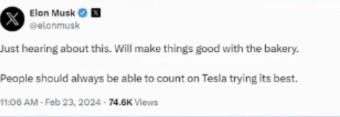 Doch dann der Knall und Grund für den Bericht am Valentinstag kam die Absage der Bestellung und das kurz und knapp via SMS!!! Für einen kleinen Bäcker ist der finanzielle Ruin und das wirtschaftliche Aus. Das traurige kommt nun: Tesla hat es nicht geschafft sich mit der Filiale persönlich in Verbindung zu setzen, bis der Fernsehsender sich der Geschichte annahm und der Druck der Bevölkerung wuchs. So musste sich Elon Musk schließlich melden. Standesgemäß per „X“ (ehemals Twitter):