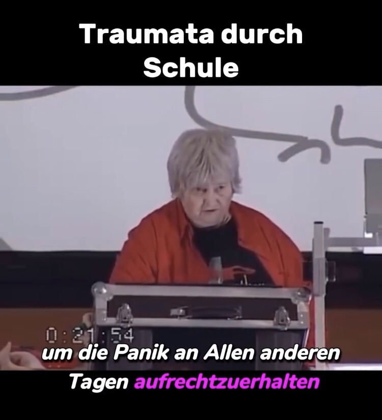 Doch Birkenbihl geht in zwei anderen relevanten Videos noch weiter. Etwa mit dem Thema „Schwächen“ … im Bezug auf Schüler oder etwa auch die Thematik „Traumata durch die Schule“, sie geht bis dahin, dass Sie Lehrer, die früher in den Ruhestand gehen oder sich bis zur Pensionierung in den Krankenstand versetzen lassen, mit Schulschwänzern vergleicht, die durch die Staatsgewalt in die Schule gebracht werden. (Videos auf Anfrage.)